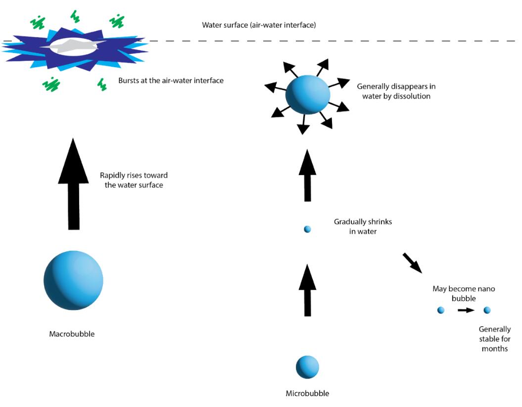 与大气泡不同,纳米气泡不会由于浮力而上升到水面。与微气泡不同,纳米气泡不会通过溶解到水中而消失在水中,而是保持纳米气泡(超细)气泡状态。在液体中寿命长的纳米气泡会随机移动,而不是像较大的气泡那样向上移动。这种随机的,有时是横向的,有时是垂直的,甚至是向下的现象被称为布朗运动。